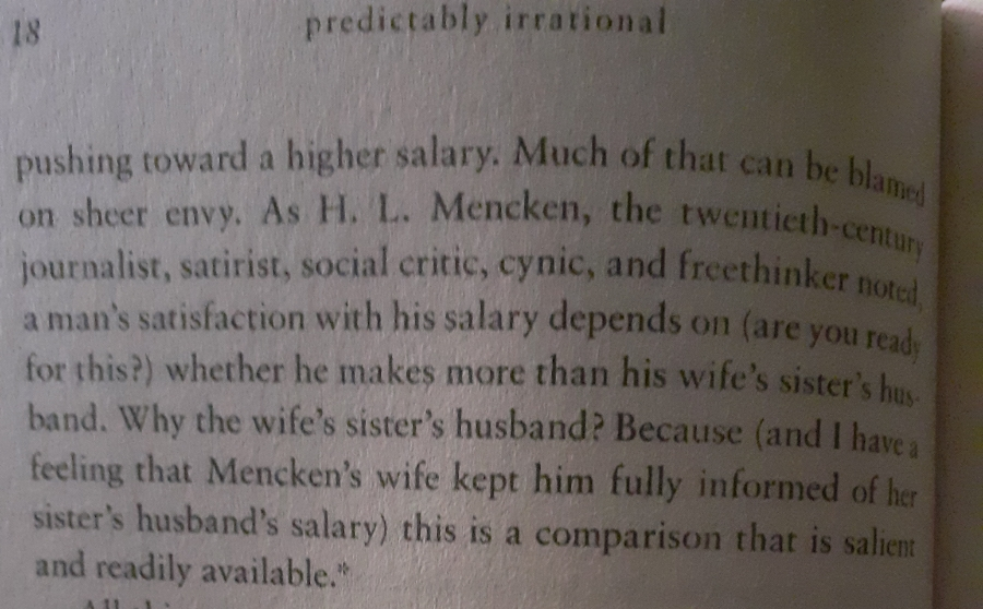 As H.L. Mencken, the twentieth-century journalist, social critic, cynic, and freethinker noted, a man's satisfaction with his salary depends on ( are you ready for this?) whether he makes more than his wife's sister's husband.