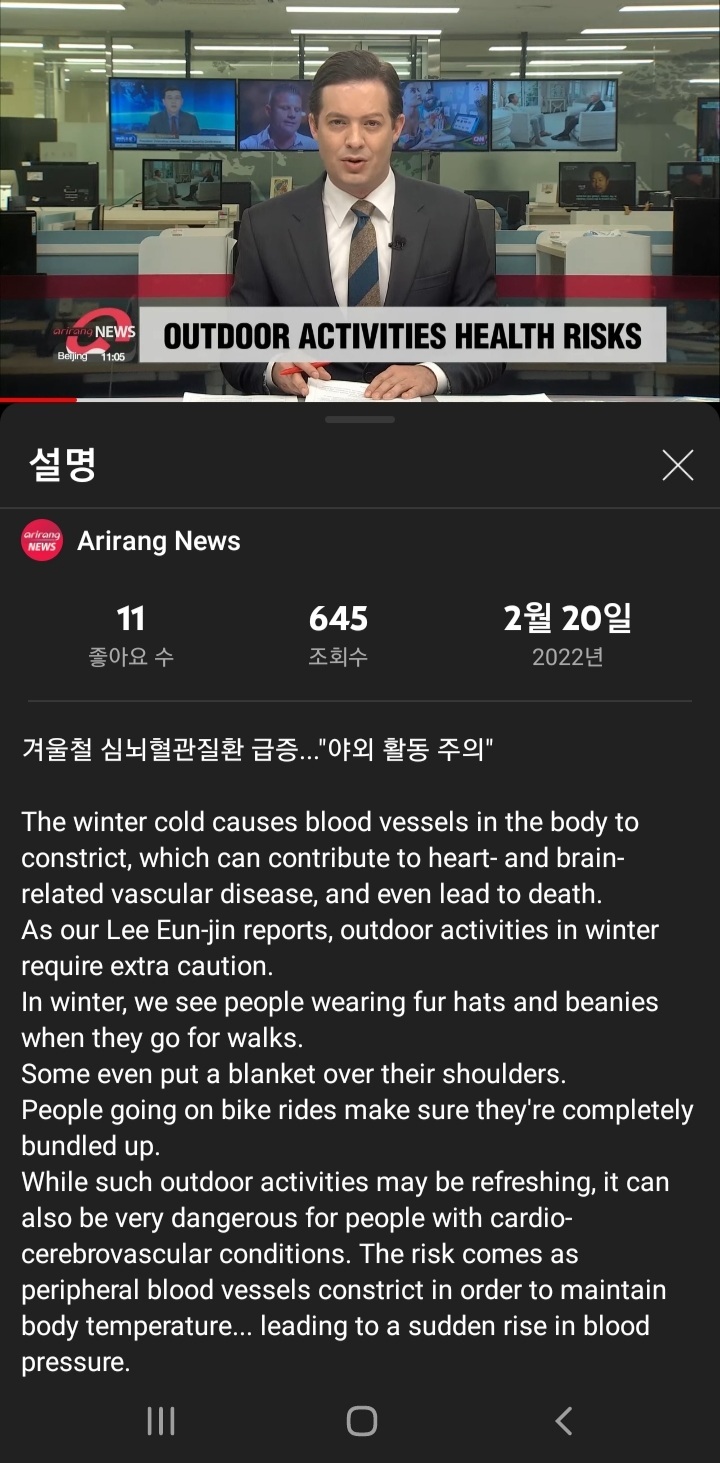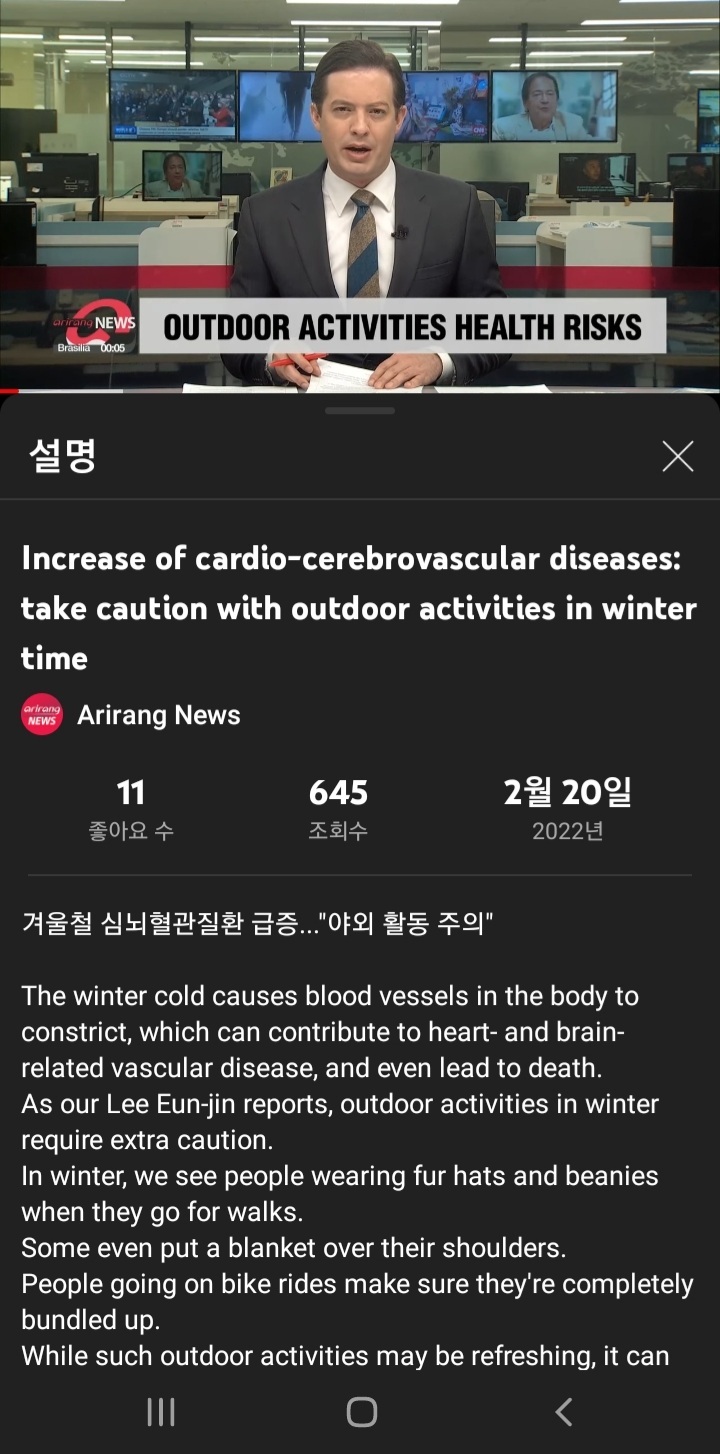 겨울추위는 신체의 심뇌혈관계의 수축으로 질병이나 사망으로까지 가게 할 수 있으므로, 이에 주의가 필요한 사람은 가볍게 외출 하더라도 위험할 수 있습니다.
