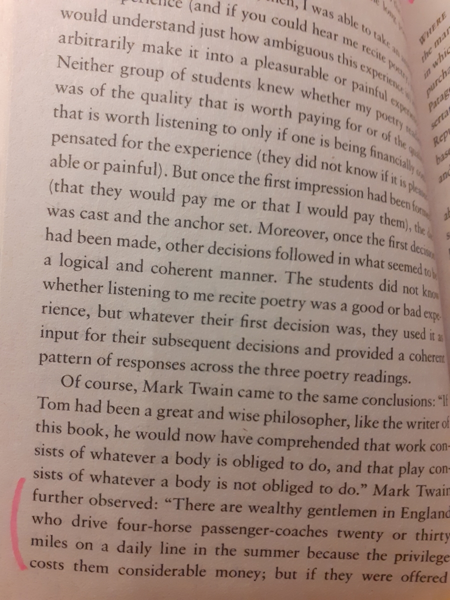 Mark Twain further observed: 'There are wealthy gentlemen in England who drive four-horse passenger-coaches twenty or thirty miles on a dail line in the summer because the previlege costs them considerable money; but if they were offered wages for the service, that would turn it into work, and then they would resign.: